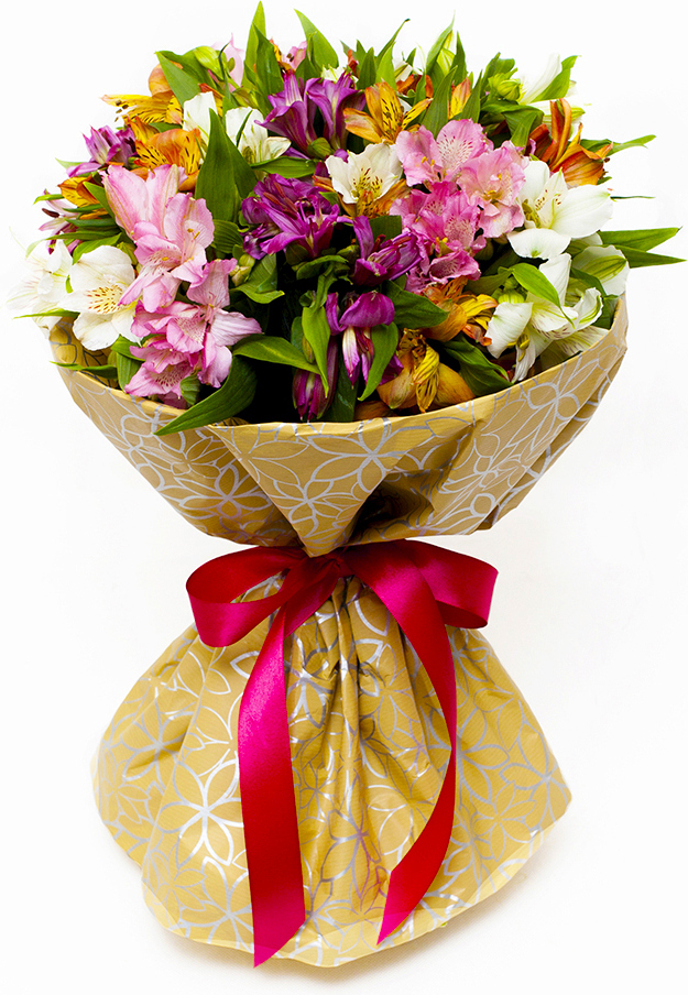 1 белая альстромерия, 1 розовая альстромерия, 1 фиолетовая альстромерия, 2 оранжевых альстромерии, упаковка, лента2 белых альстромерии, 2 розовых альстромерии, 2 фиолетовых альстромерии, 3 оранжевых альстромерий, упаковка, лента7 белых альстромерий, 7 розовых альстромерий, 6 фиолетовых альстромерий, 7 оранжевых альстромерий, упаковка, лента