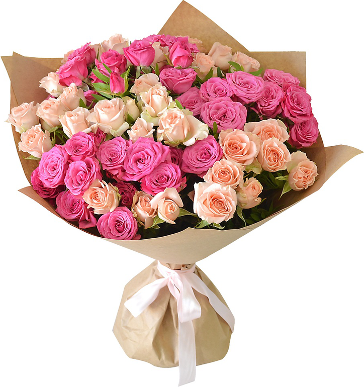 2 розовых кустовых розы, 3 кремовых кустовых розы, упаковка, лента3 розовых кустовых розы, 4 кремовых кустовых розы, упаковка, лента8 розовых кустовых роз, 7 кремовых кустовых роз, упаковка, лента
