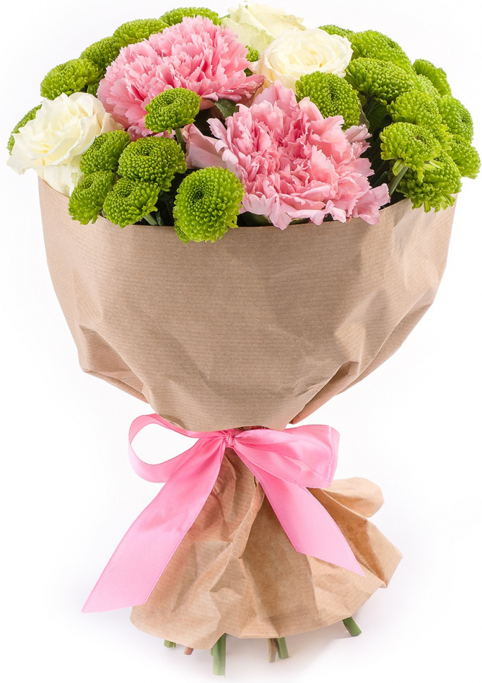Оригинальный чувственный букет из великолепных зеленых хризантем, трепетных белых роз и нежных розовых гвоздик - это букет - послание, несущий в себе многозначительный смысл. С древних времен считалось, что гвоздика является воплощением верховного божества, это "цветок Бога", наполненный великой благотворной силой. Букет, где прекрасная гвоздика находится в сочетании с белыми розами - символом чистой любви и зелеными хризантемами - символом постоянного обновления жизни и её бесконечности - это пожелание счастливой жизни, вечной и светлой любви и благополучия.